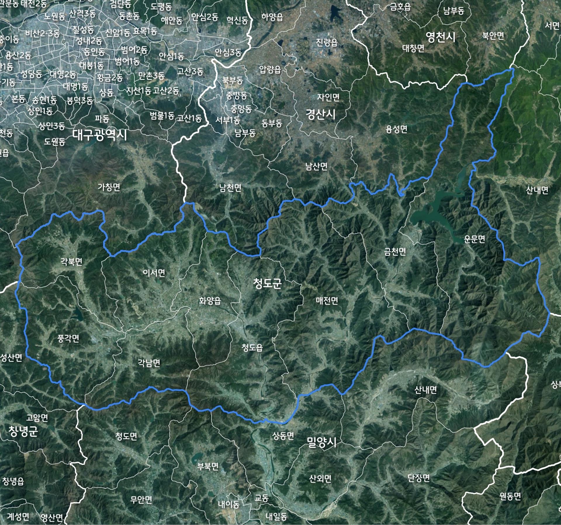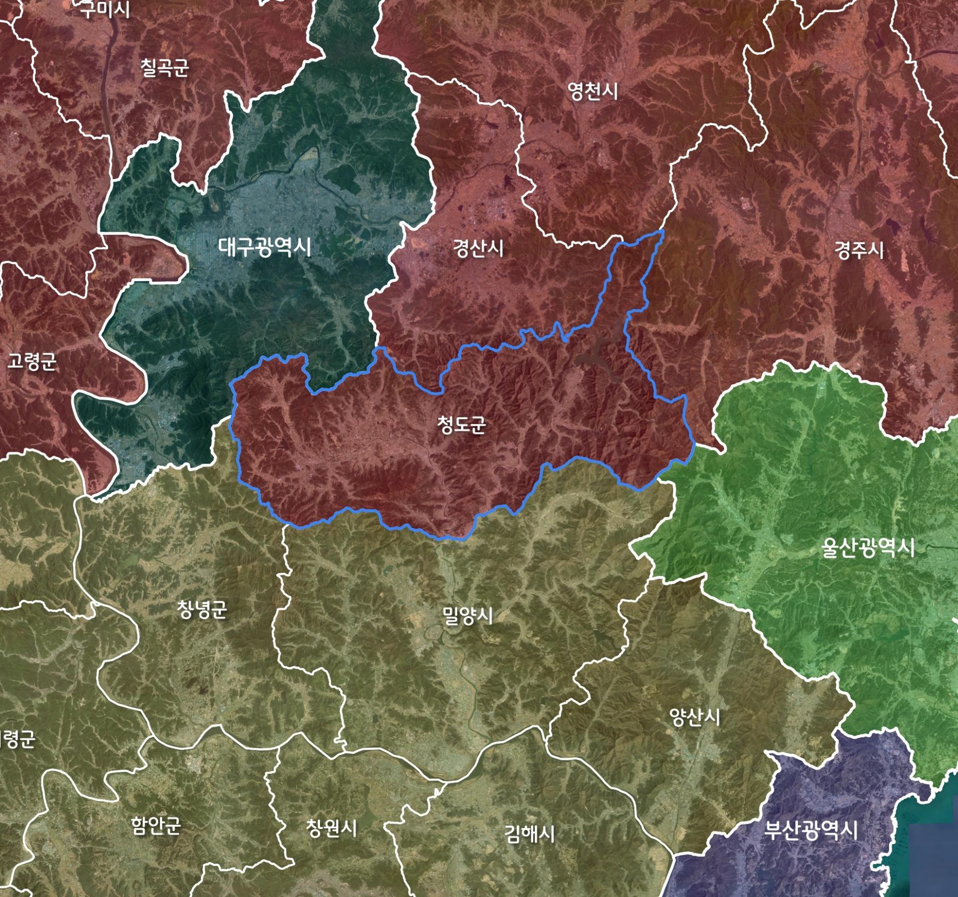| 서울특별시 ( 605,214 ㎢*) | 경북 청도군 ( 698,450 ㎢, 서울 대비 115%) |