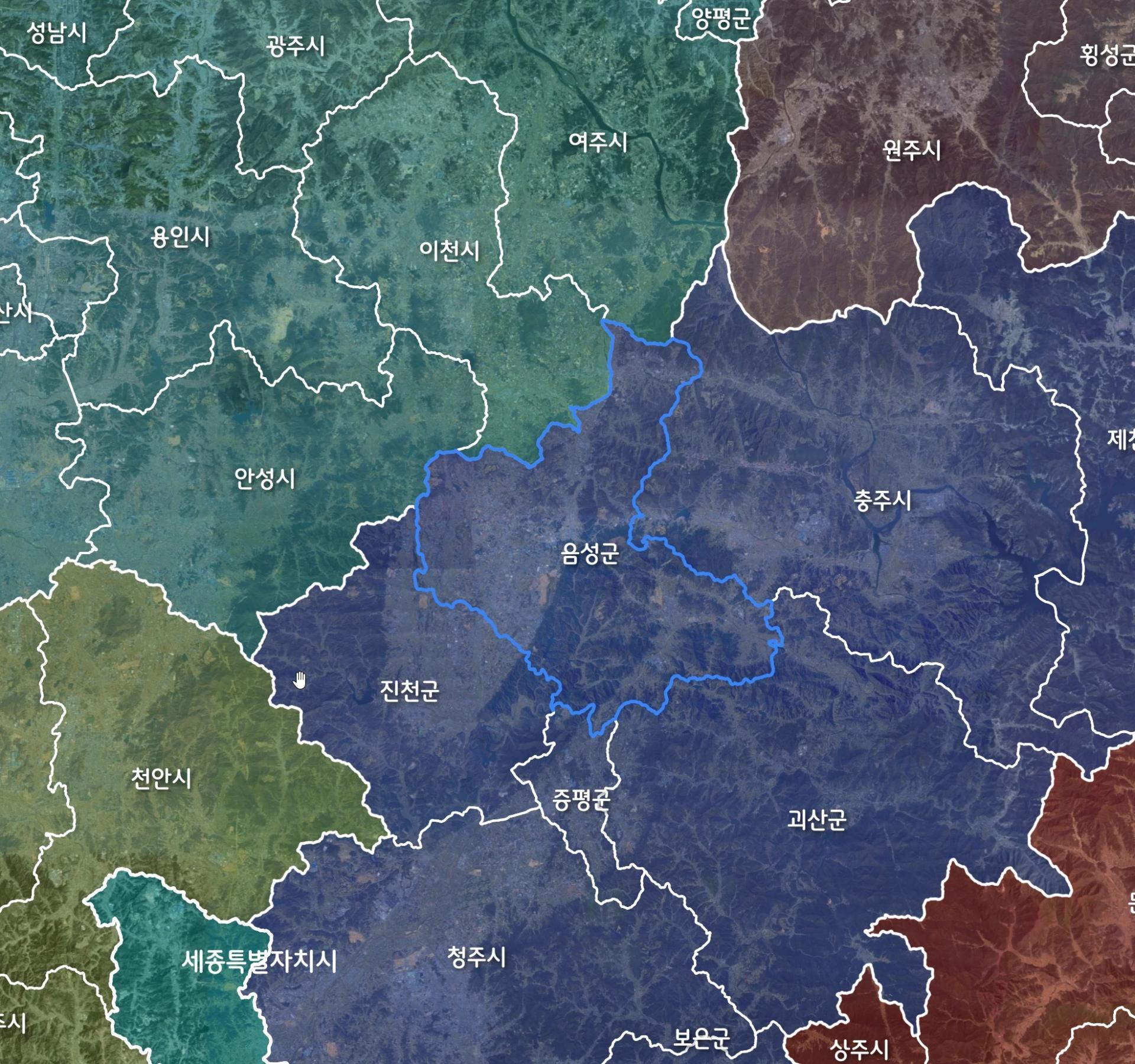 | 서울특별시 ( 605,214 ㎢*) | 충북 음성군 ( 520,107 ㎢, 서울 대비 86%) |