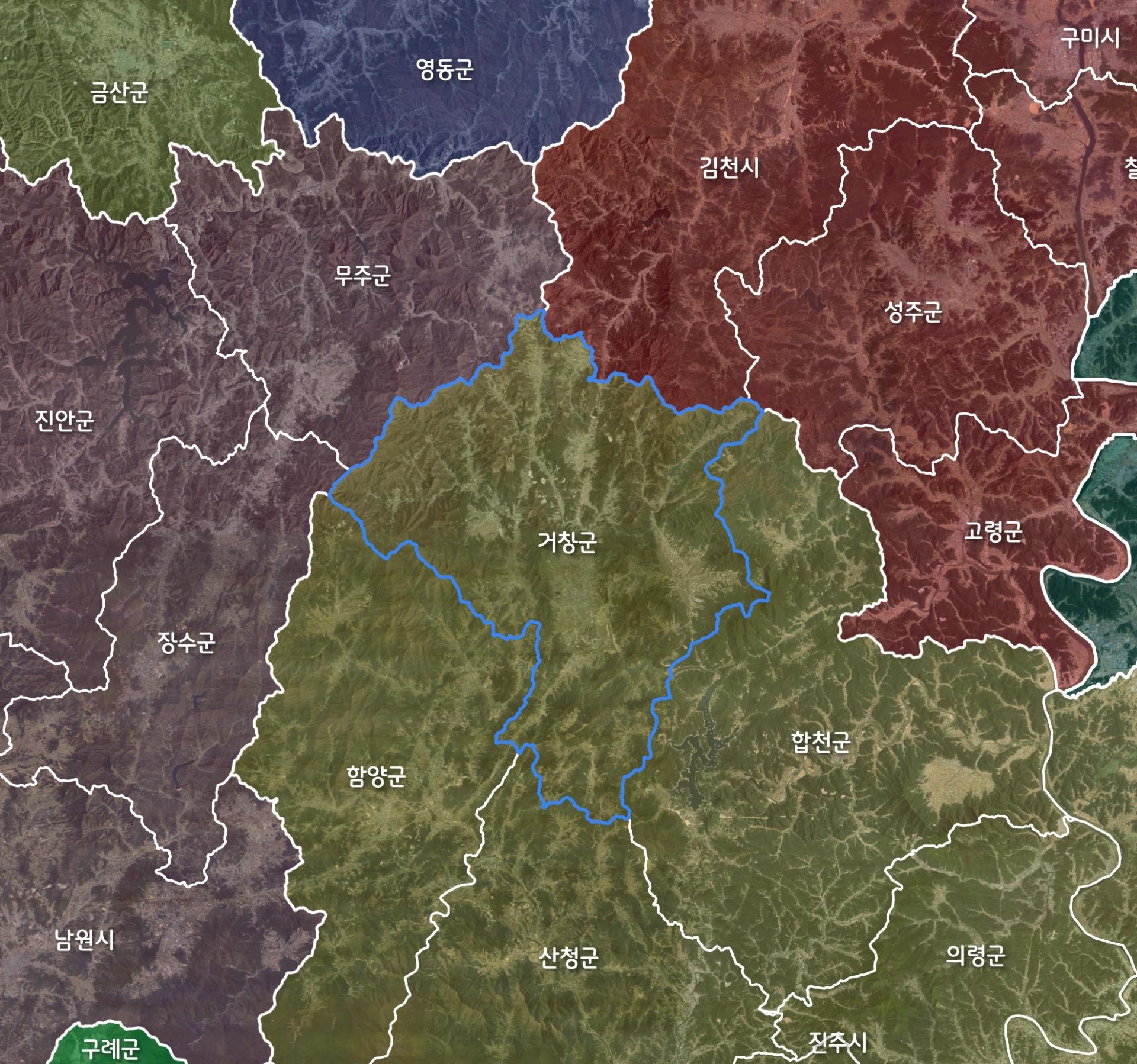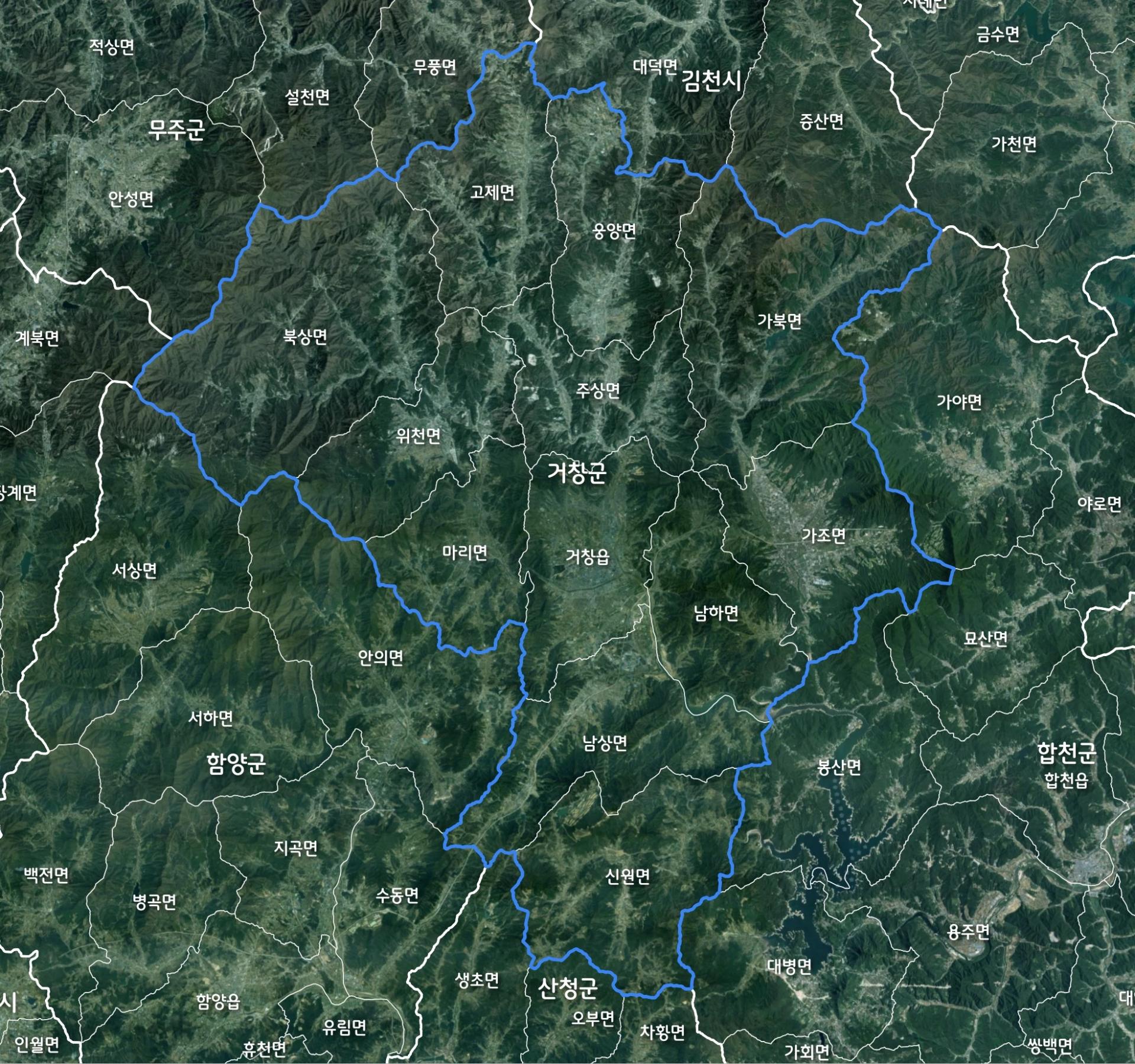 | 서울특별시 ( 605,214 ㎢*) | 경남 거창군 ( 803,956 ㎢, 서울 대비 133%) |