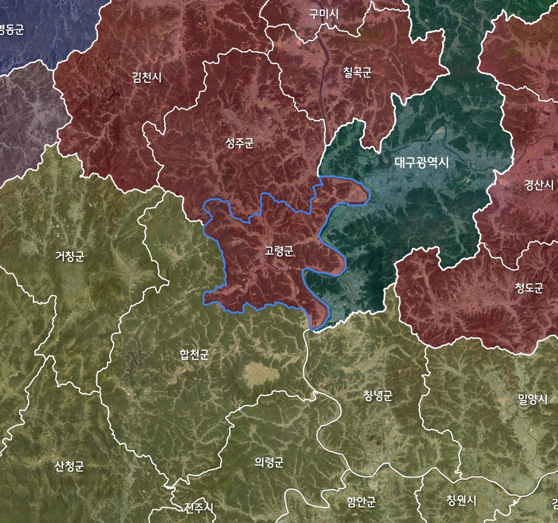 | 서울특별시 ( 605,214 ㎢*) | 경북 고령군 ( 384,245 ㎢, 서울 대비 63%) |