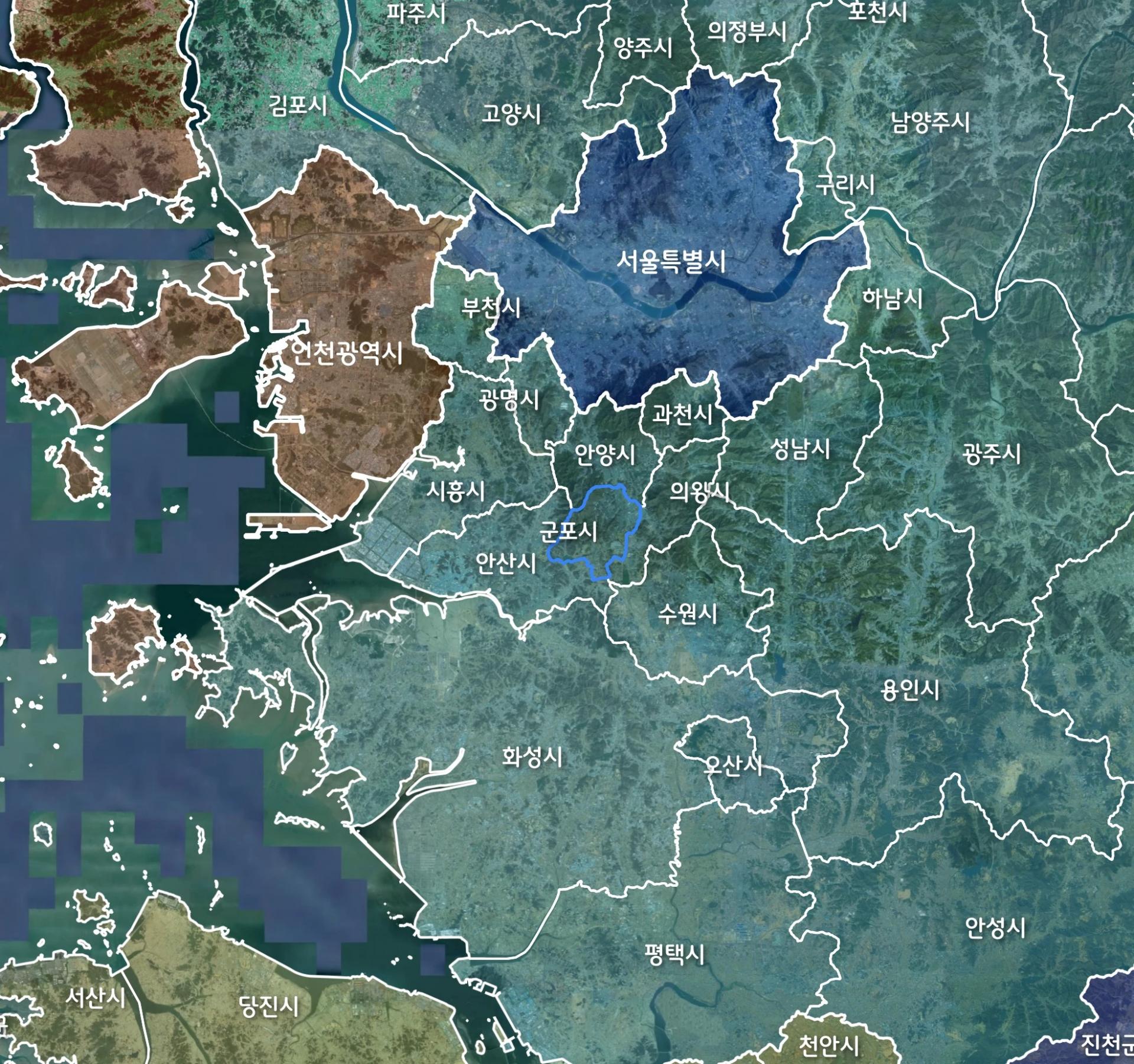 | 서울특별시 ( 605,214 ㎢*) | 경기 군포시 ( 36,418 ㎢, 서울 대비 6%) |