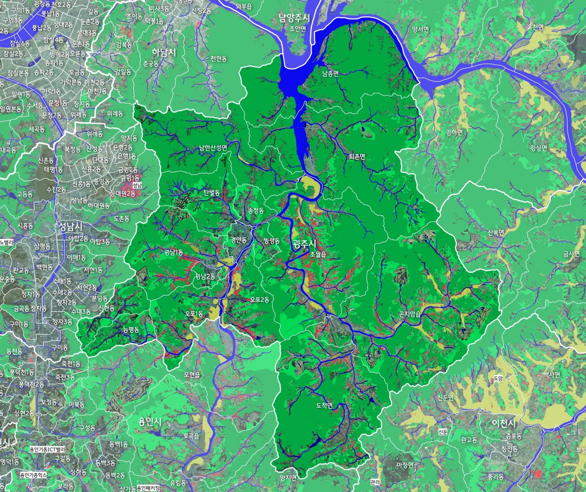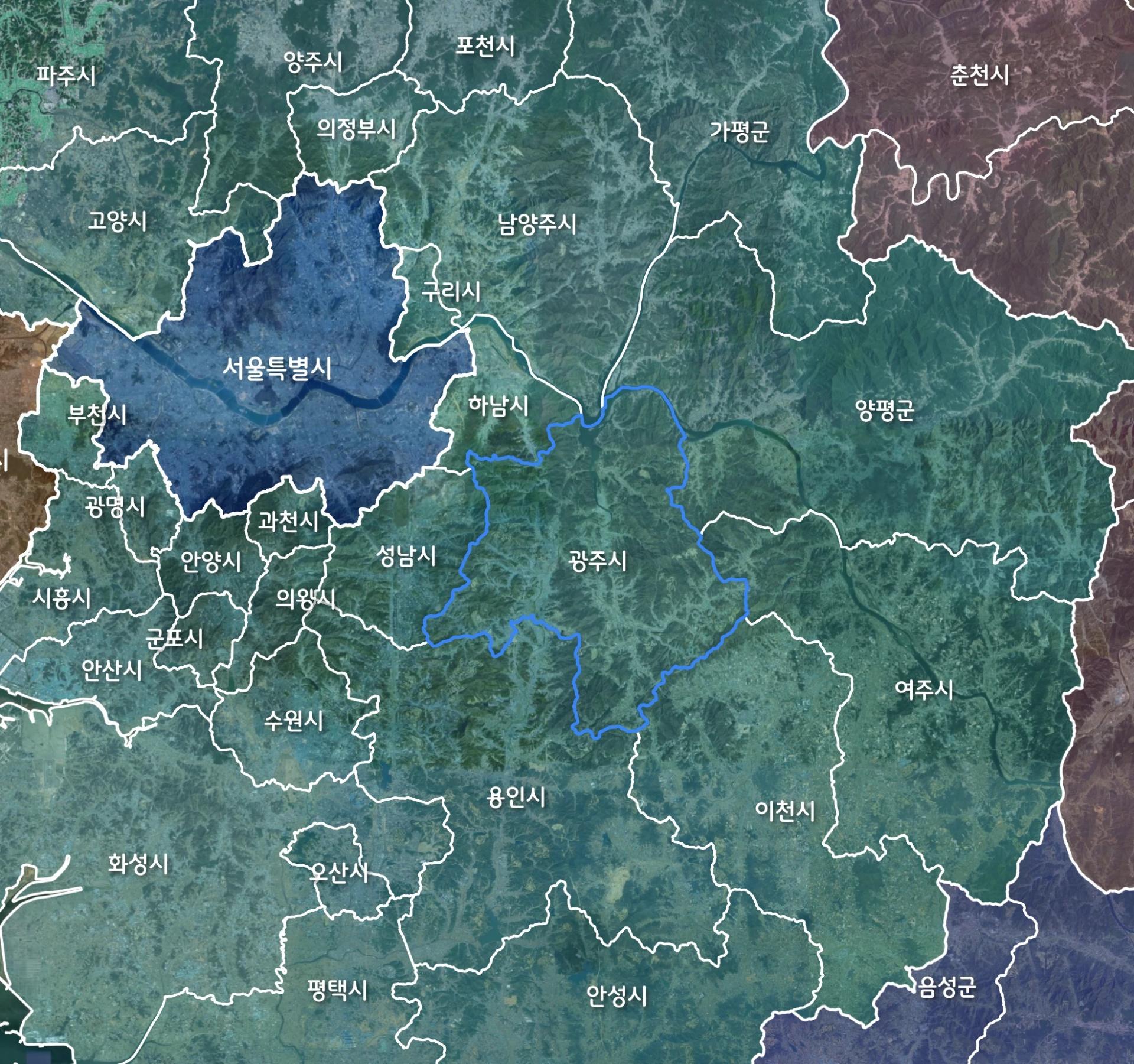 | 서울특별시 ( 605,214 ㎢*) | 경기 광주시 ( 430,990 ㎢, 서울 대비 71%) |