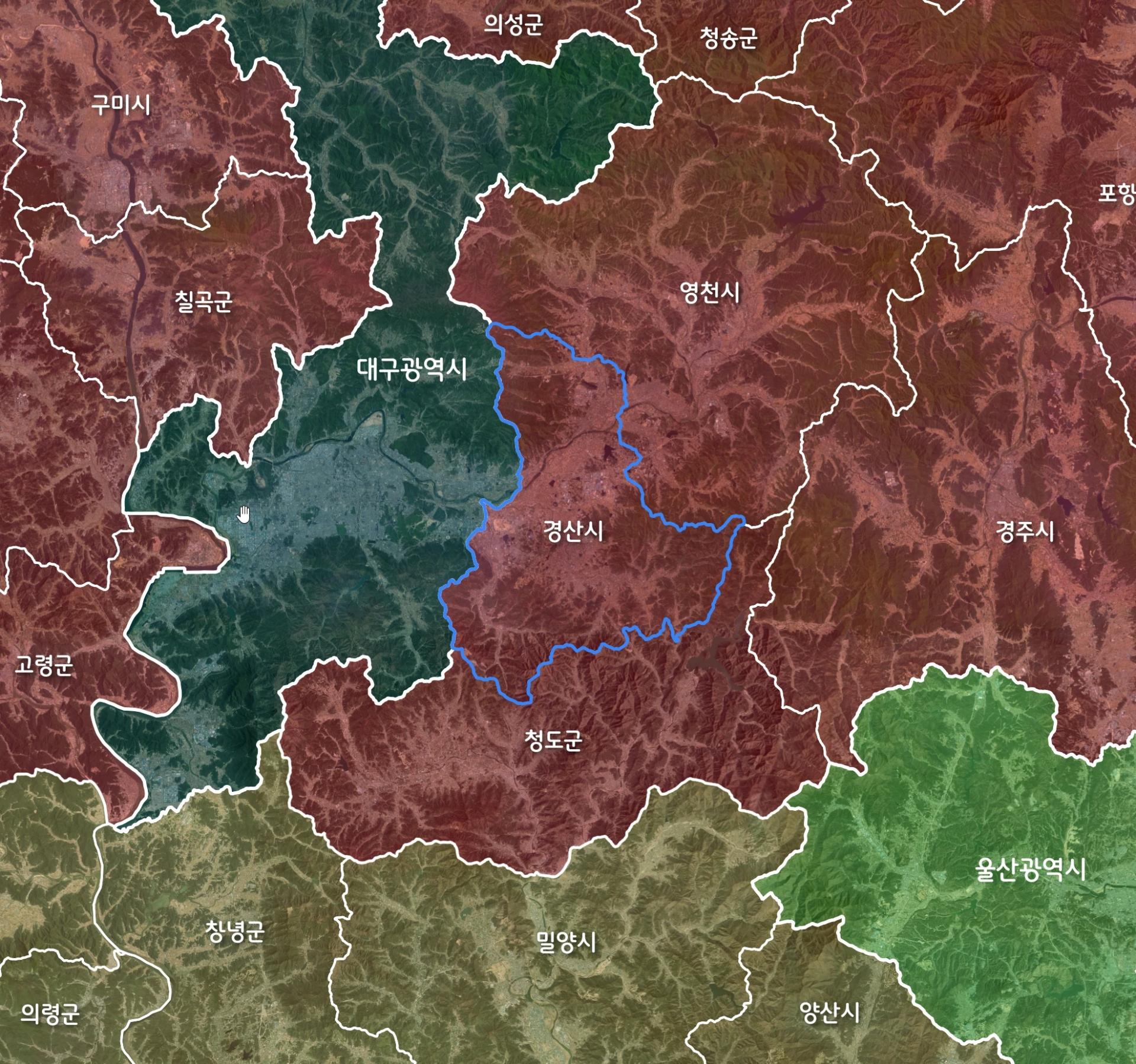 | 서울특별시 ( 605,214 ㎢*) | 경북 경산시 ( 411,875 ㎢, 서울 대비 68%) |