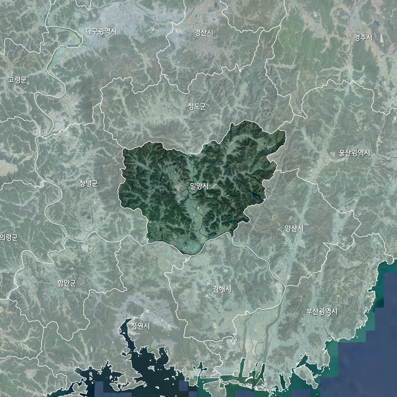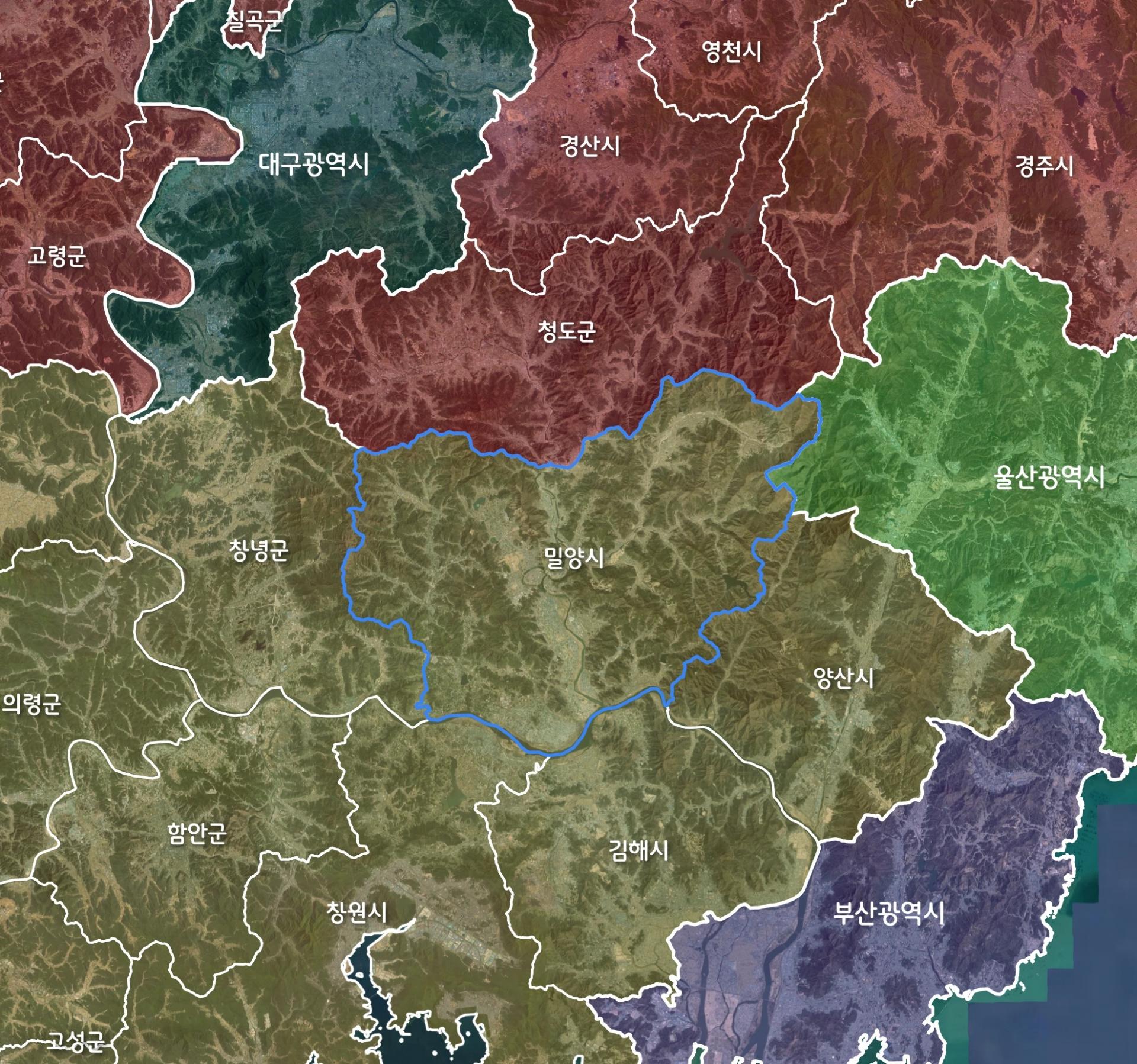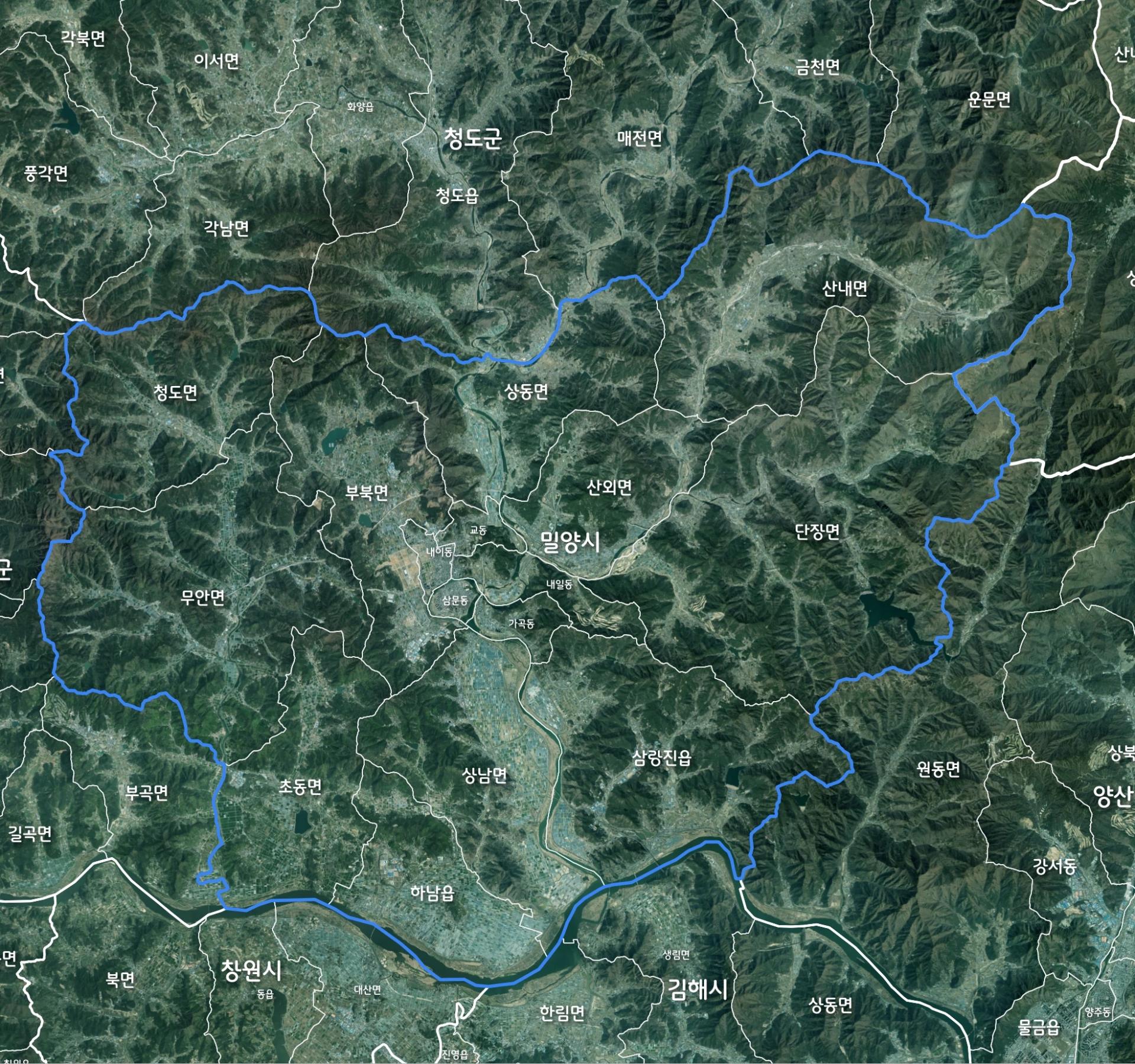 | 서울특별시 ( 605,214 ㎢*) | 경남 밀양시 ( 798,711 ㎢, 서울 대비 132%) |