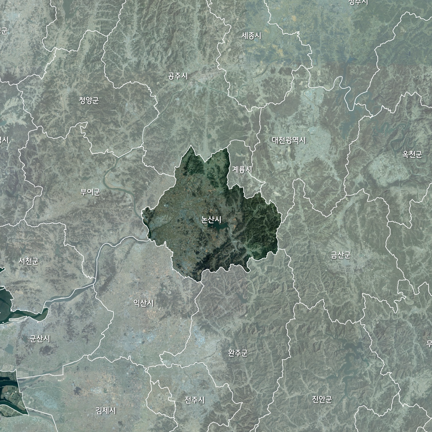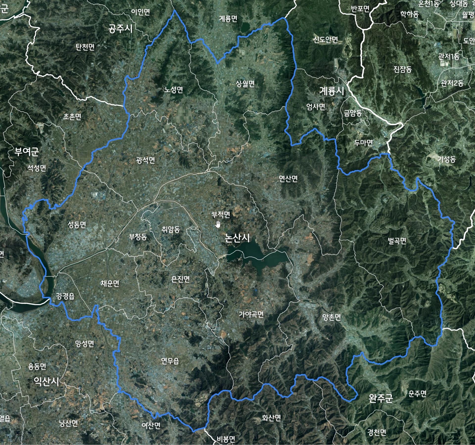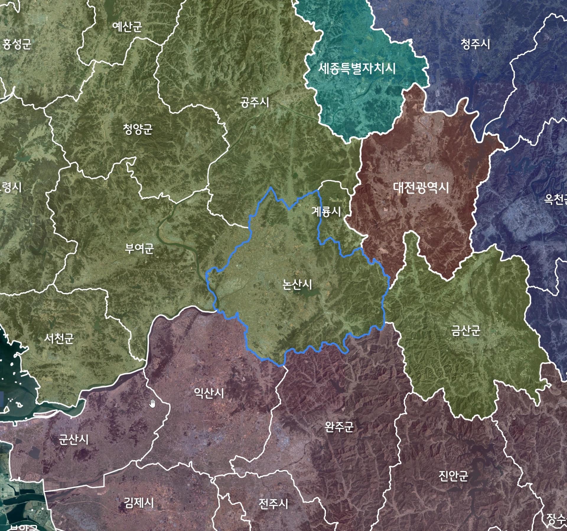 | 서울특별시 ( 605,214 ㎢*) | 충남 논산시 ( 556,175 ㎢, 서울 대비 92%) |