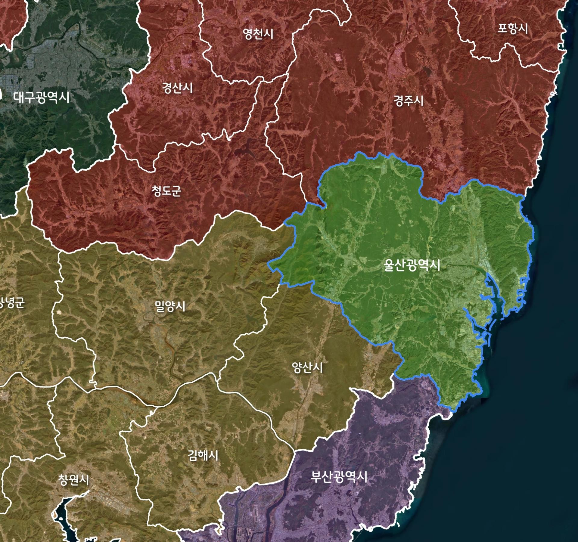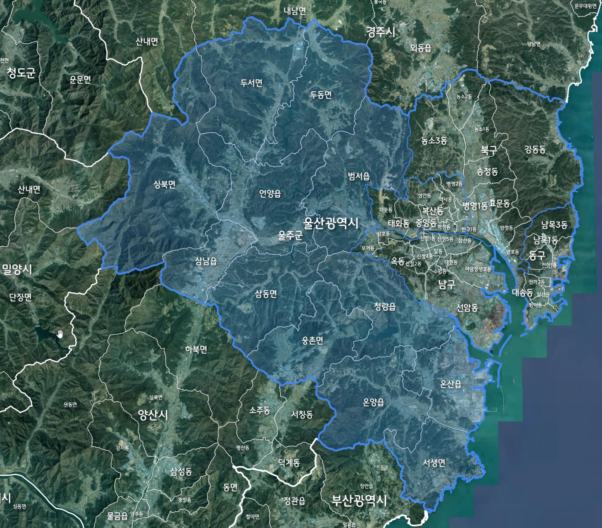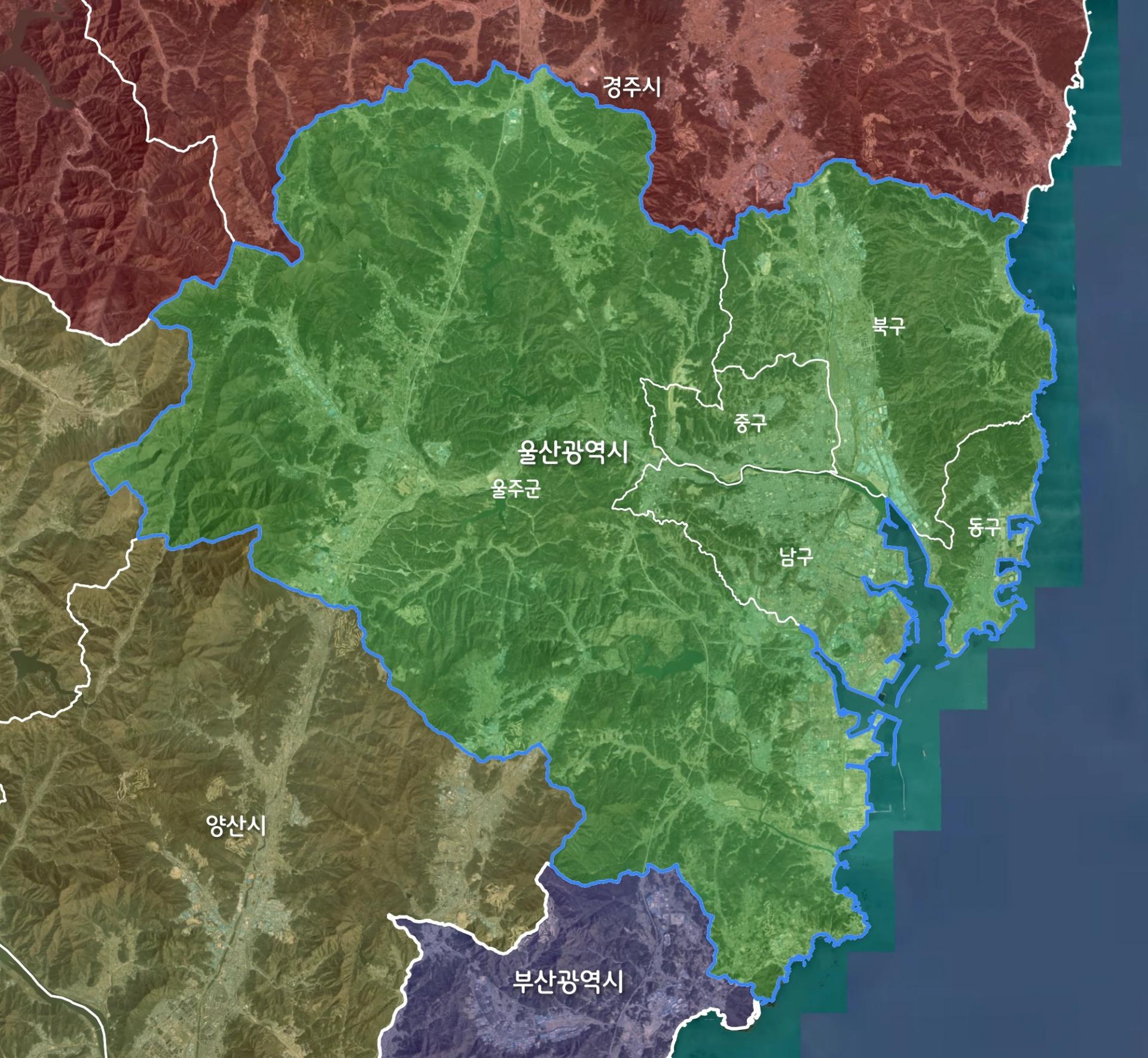 | 서울특별시 ( 605,214 ㎢*) | 울산광역시 ( 1,062,903 ㎢, 서울 대비 176%) |