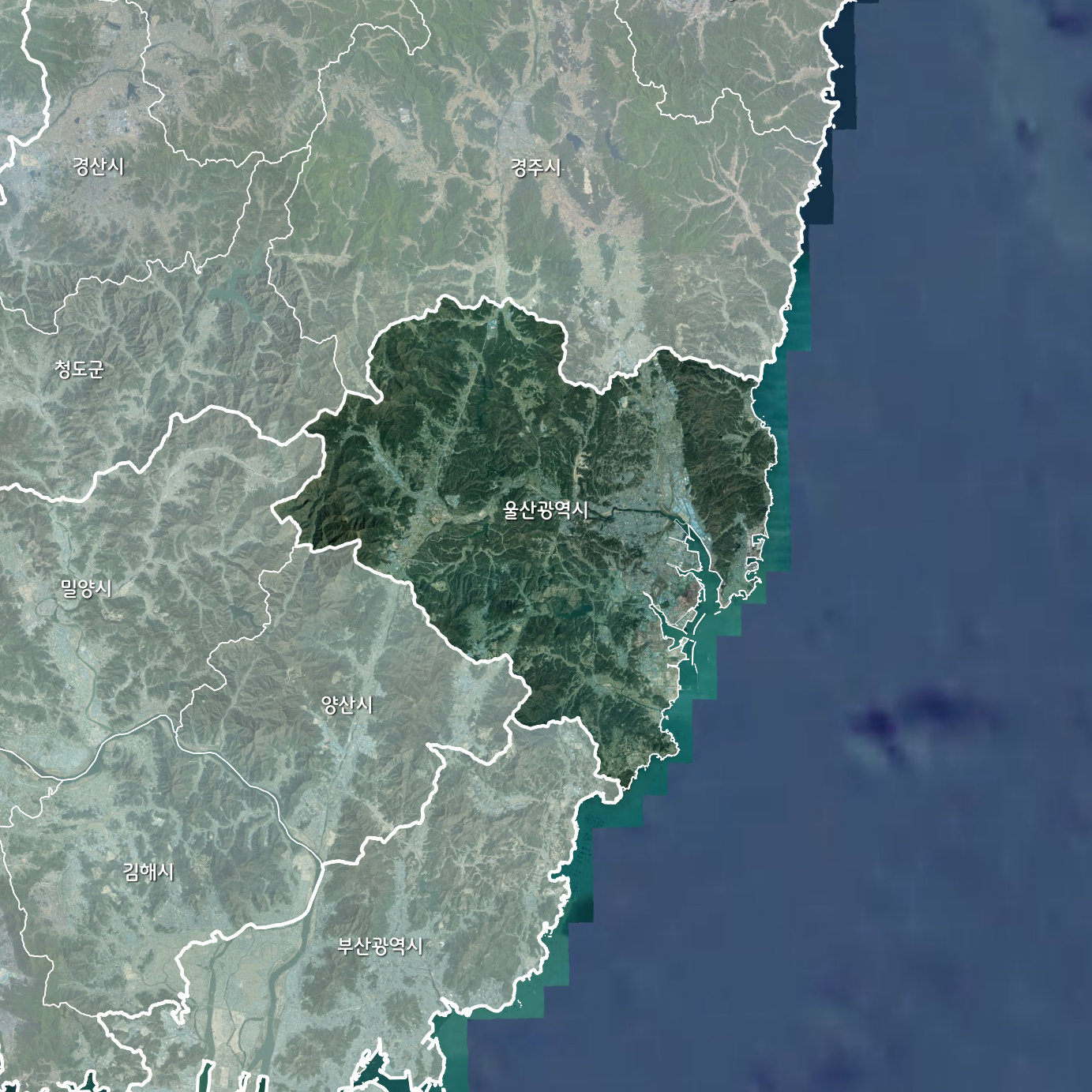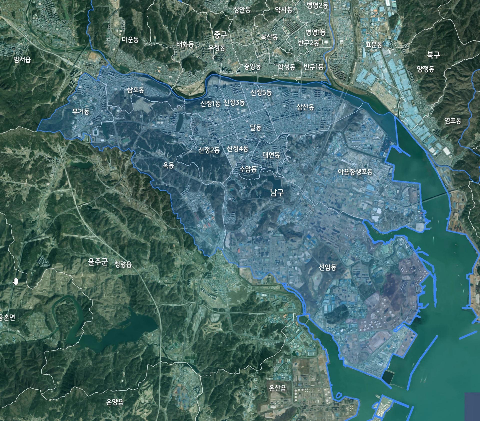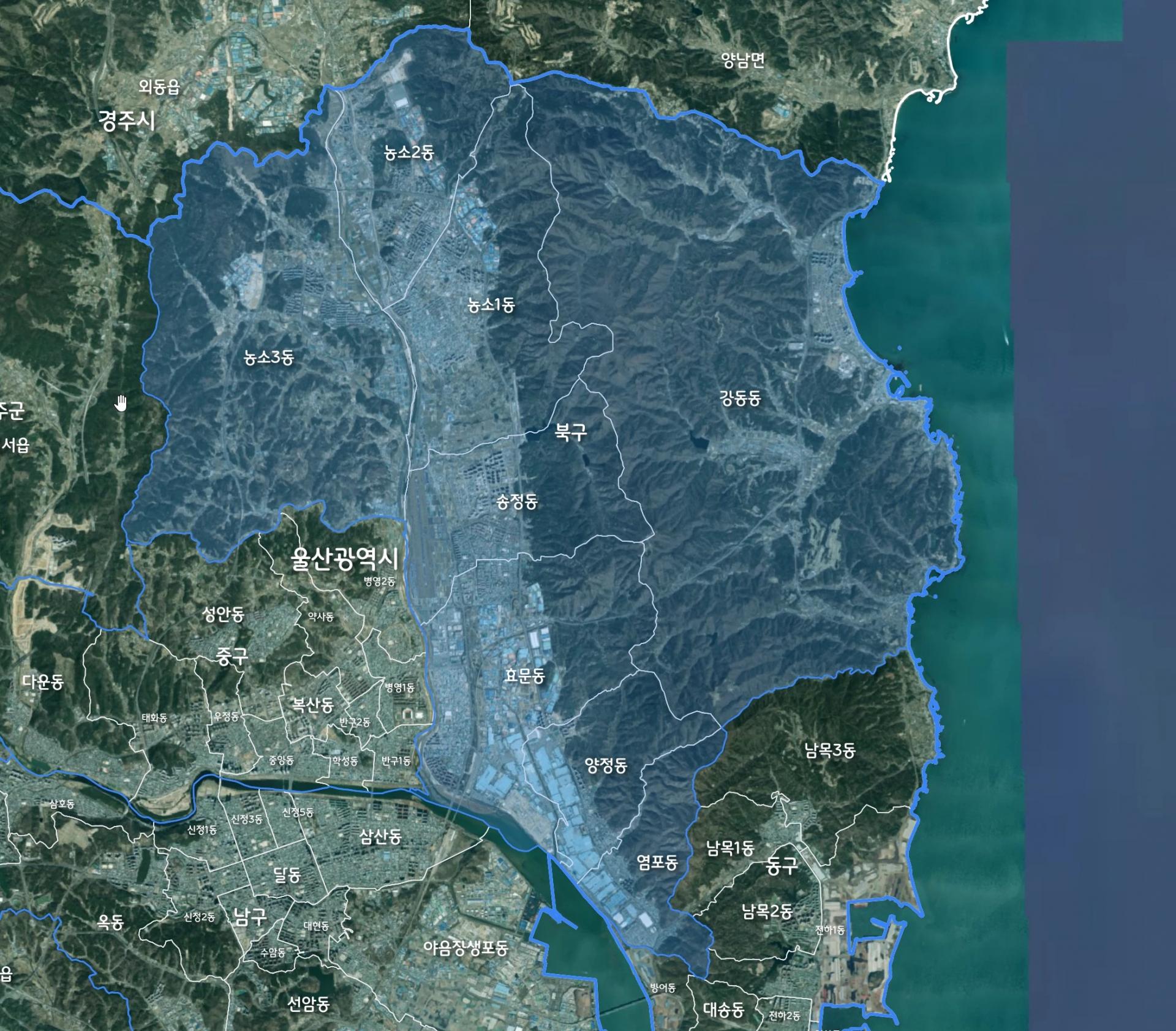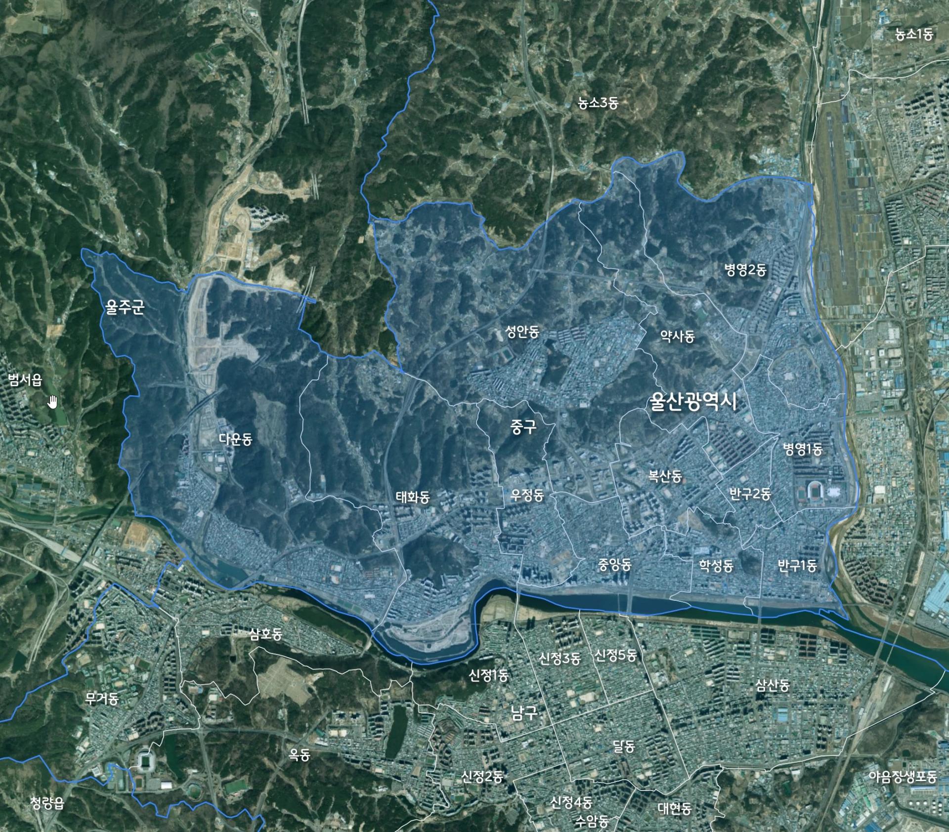 | 서울특별시 ( 605,214 ㎢*) | 울산광역시 ( 1,062,903 ㎢, 서울 대비 176%) |