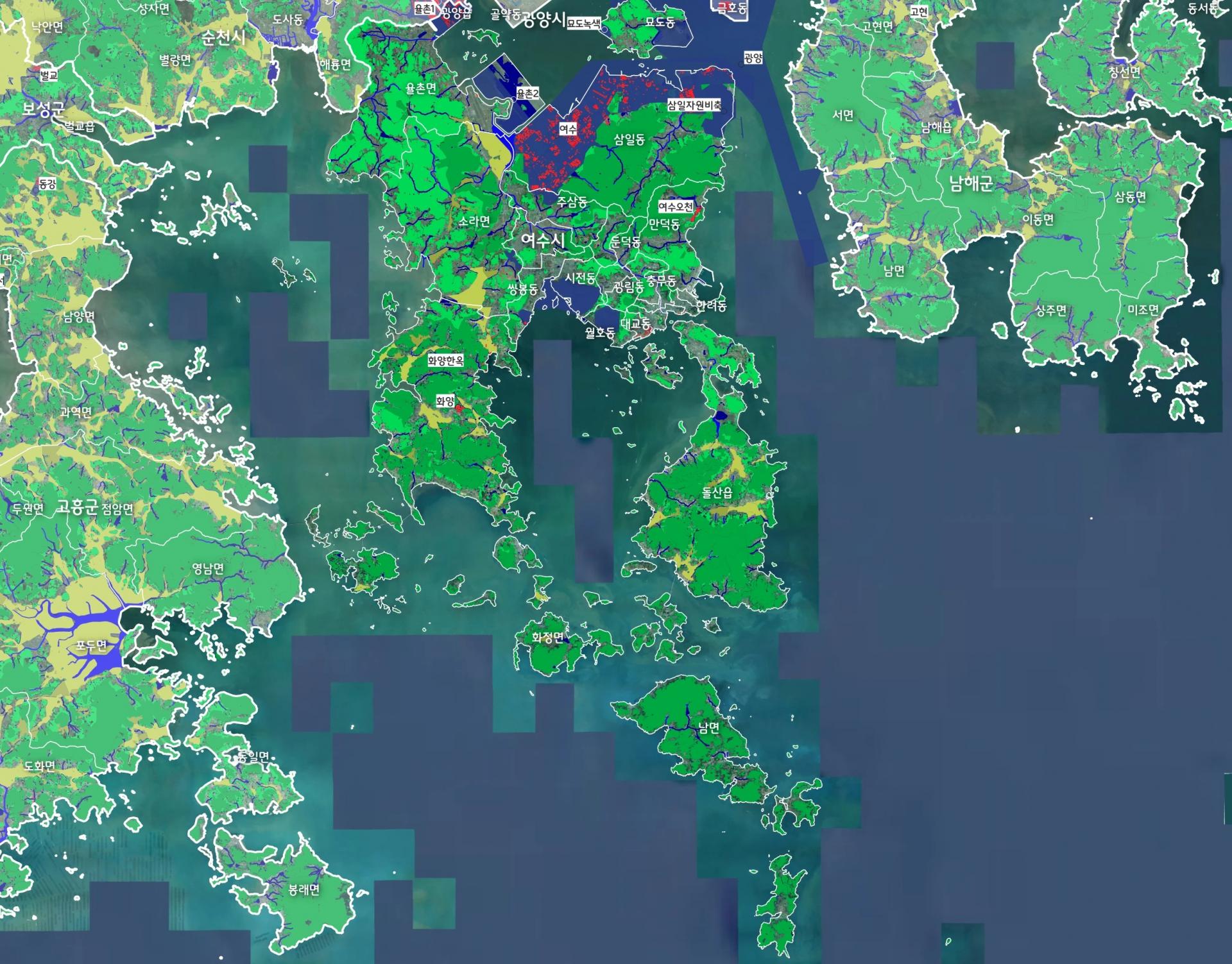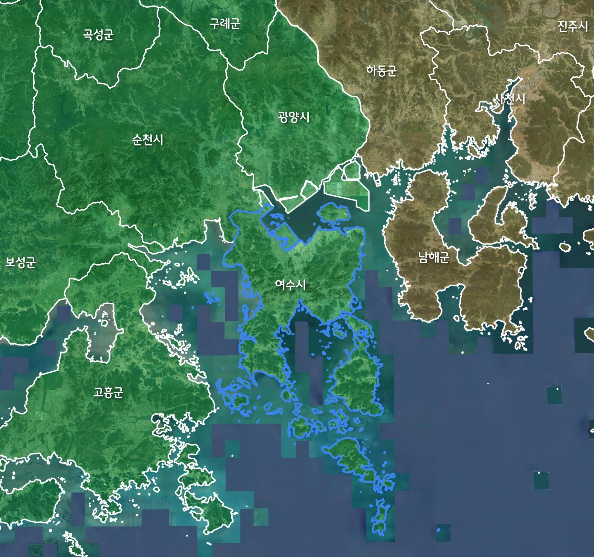 | 서울특별시 ( 605,214 ㎢*) | 전남 여수시 ( 512,335 ㎢, 서울 대비 85%) |